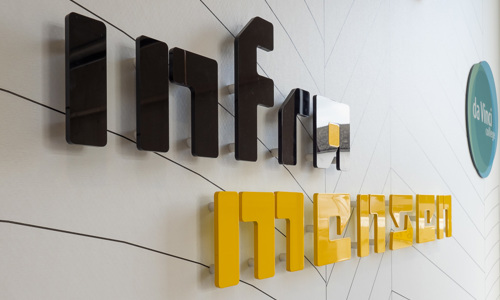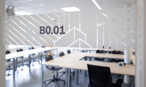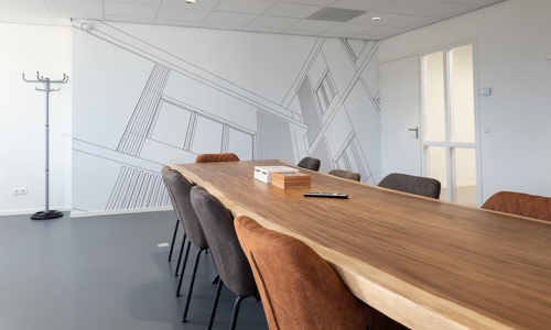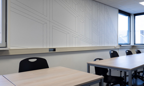 Voor de aankleding van de lokalen, algemene ruimtes en gangen gebruikten we diverse materialen zoals bedrukt Airtex behang, geplexificeerde prints op Dibond, peesdoek in frame en opvallende acrylaatletters.