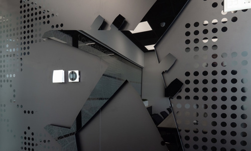 De muren en glazen wanden zijn door JEU op locatie bekleed. Daarbij is onder andere gebruik gemaakt van PVC-vrij behang, PET-felt, peesdoek, plaatmateriaal en JEU Noir.