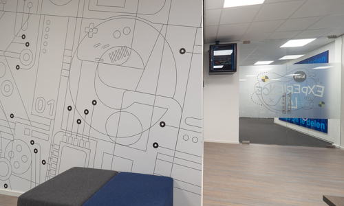 Om deze ruimte van een passende uitstraling te voorzien werd JEU ingeschakeld. In het ontwerp werd gebruik gemaakt van thema's en patronen uit de ICT-techniek en crash tests. Raamfolies bieden privacy en filteren het licht.