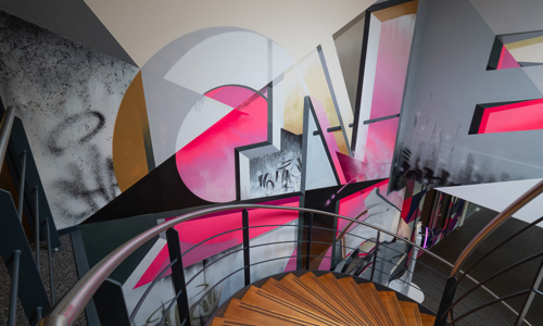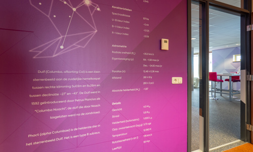 In het pand was al een opvallende grafitti aanwezig, waar het ontwerp van de aankleding natuurlijk op moest aansluiten. Een leuke uitdaging voor onze designers! Gekozen werd voor een thema dat is afgeleid van de betekenis van het woord Phact. Phact is de naam van de helderste ster van het sterrenbeeld Duif. Dit element komt op verschillende, kunstzinnige manieren terug in het ontwerp. De gekozen kleuren zorgen voor een warme sfeer in het bedrijf.