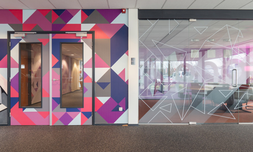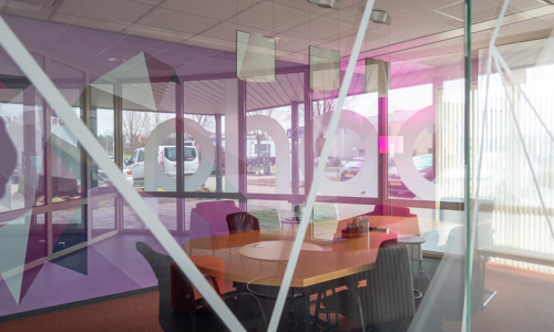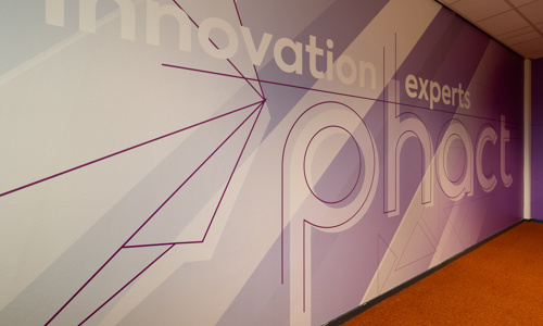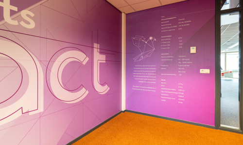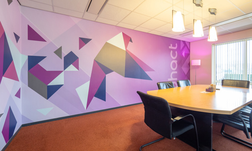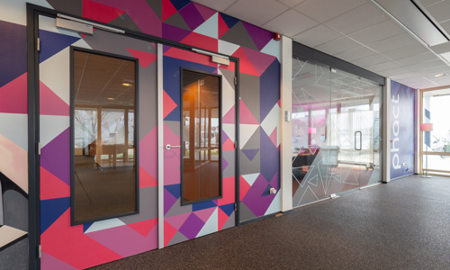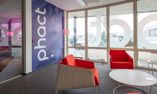 Als innovatieve onderneming hecht Phact veel waarde aan een werkplek waar medewerkers zich prettig voelen. De aankleding van het interieur is daarbij geen ondergeschoven kindje. Toen Phact dan ook eigenaar werd van het gehele bedrijfspand, werd na een kennismaking met JEU besloten om het interieur te voorzien van aankleding met prints en raamfolies met een design dat past bij de organisatie.