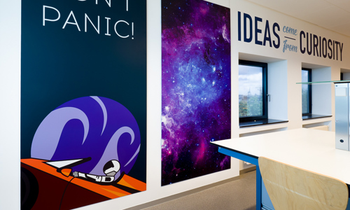 Om in de klaslokalen een inspirerende leeromgeving te creƫren, hebben we de muren aangekleed met aansprekend en toepasselijk design. In overleg met STC is gekozen voor thematische ontwerpen, uitgevoerd op verschillende materialen en afgedrukt met behulp van diverse printtechnieken.