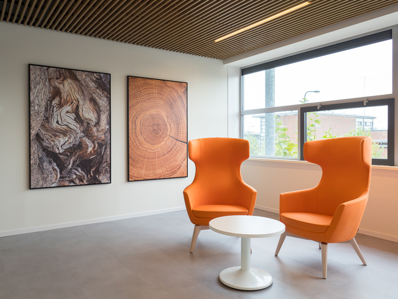 Kantoor inrichten met oog voor akoestiek? JEU verwerkt geluidsabsorberende materialen achter visuals en in textielframes. Zo verbeteren we de akoestiek zonder concessies aan design. Rust, focus en prettig samenwerken gaan hand in hand in een inspirerend kantoorinterieur.